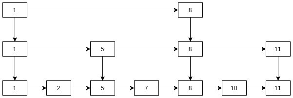 跳表的一般结构, 将一维链表升维成二维: