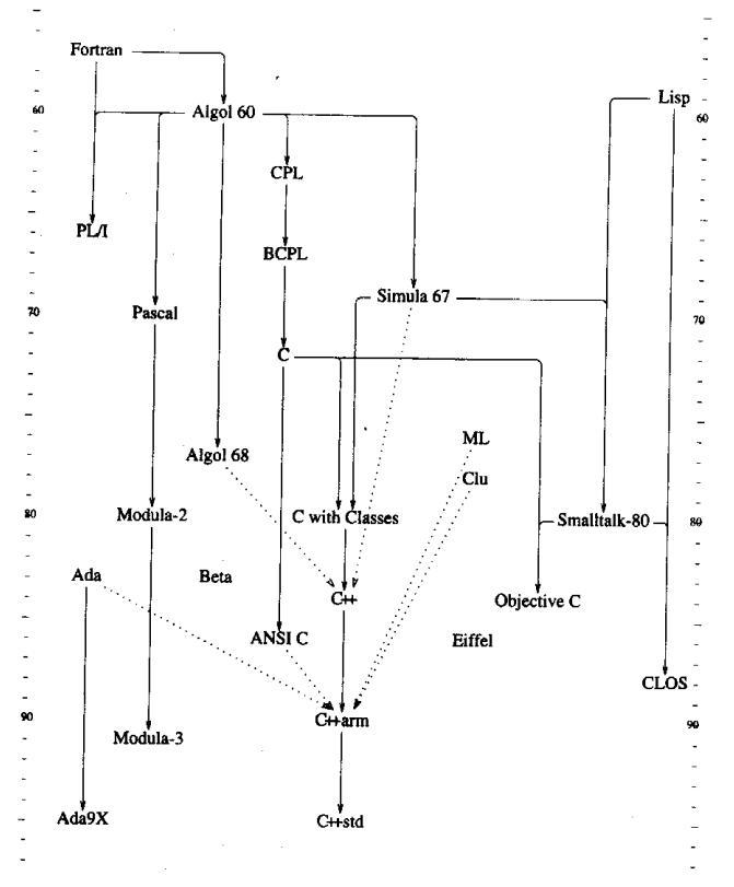 首先,我们需要再一次重新认识到,C++并不是C的补充,也不是C的扩展,C++是一门全新的语言,我甚至认为这种认识是十分重要的。认识到C++是一门全新的语言将对我们的编码风格、组织以及思考方式都有帮助。在Stroustrup早期著作《C++语言的设计和演化》中,有这样一张图说明这种语言的演化关系: