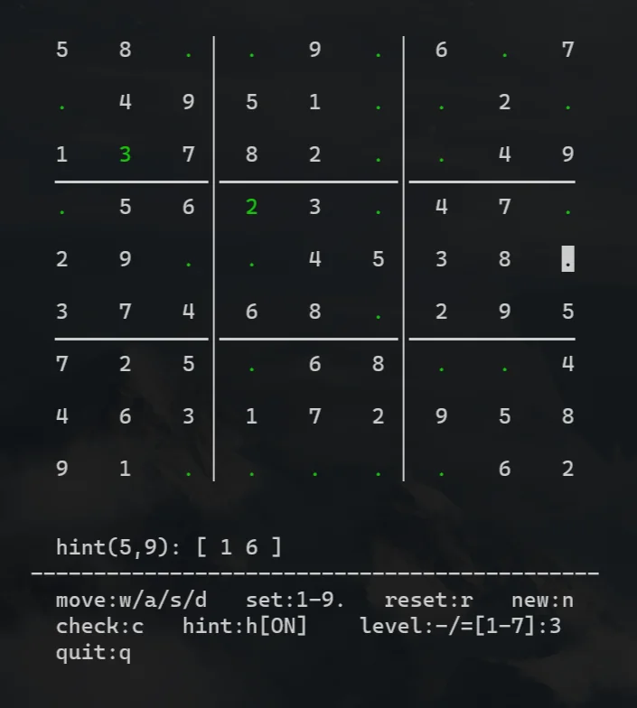 h, 提示当前空格可以填入的候选项, 该候选项不保证可解 - 更换难度: